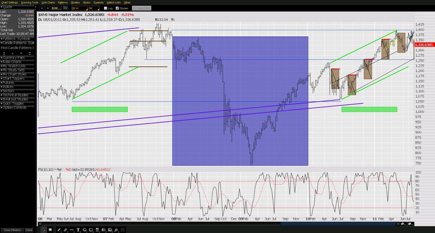 Below is an EchoVectorVEST EasyGuideChart, $XMI basis, clearly illustrating the efficacy of Presidential Cycle EchoVectors.  Another entire webpage at the ProtectVest website is dedicated to illustrating the current PCEVs generated within the MDPP Forecast Model.  Below, isolating on the horizontal 'green bar period' within the Presidential EchoVector, strong price ascension and then derivative toppiness in May can be viewed.  Note the green PCEV parallel ascending vector.  Note also the ascension start dates and the blue blue EV horizontal baseline price start on those start dates.   Additionally note the corresponding price levels, May 2007 to May 2011. ("Sell in May and go away" is again also apparent.)  The two year long purple/blue box illustrates a CCEV (Congressional Cycle EchoVector) period.  It also depicts an intersect period with the EchoVectorVEST MDPP RCCEV. Also see the powerful reverse head and shoulders pattern in the blue box.